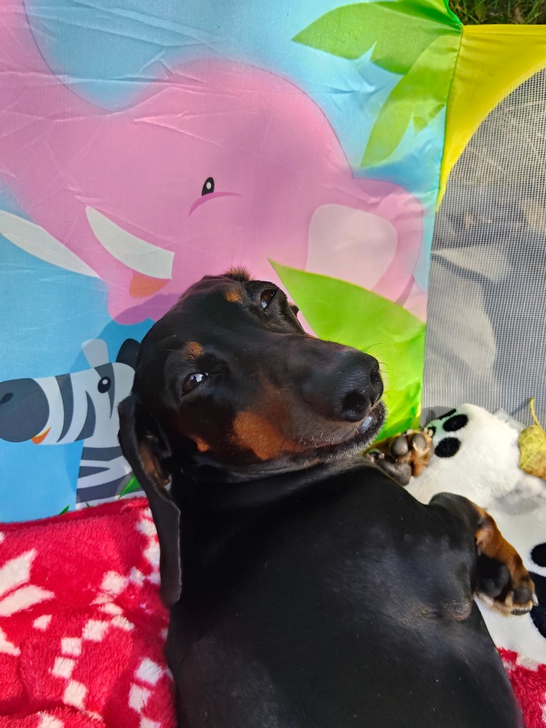 Wrocilysmy więc nad jezioro, zabierając z domu dodatkowy koc, krótką smycz i dziecięcy kojec turystyczny (by Momo nie kręciła się przy namiocie). Pani doktor mówiła że Momo musiala coś naciągnąć lub nadwyrężyć i leki w połączeniu z odpoczynkiem powinny szybko zmniejszyć ból.